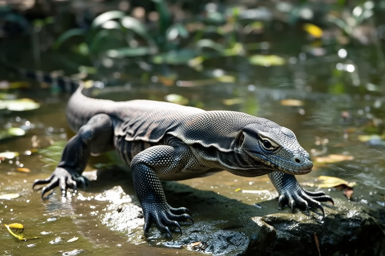 Water monitors (Varanus salvator) are among the largest lizards in the world, capable of growing up to 9 feet in length. Their most striking feature is their sleek, muscular body, perfectly adapted for life both on land and in water. Their long, powerful tails act as rudders when swimming, allowing them to move gracefully through aquatic environments. Water monitors have sharp claws and strong jaws, making them adept hunters. They possess excellent vision and sense of smell, which helps them locate prey efficiently.